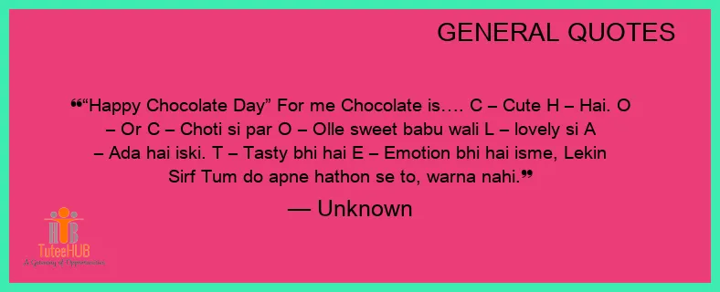 “Happy Chocolate Day” For me Chocolate is…. C – Cute H – Hai. O – Or C – Choti si par O – Olle sweet babu wali L – LOVELY si A – Ada hai iski. T – Tasty bhi hai E – Emotion bhi hai isme, Lekin Sirf TUM do apne hathon SE to, WARNA nahi.
