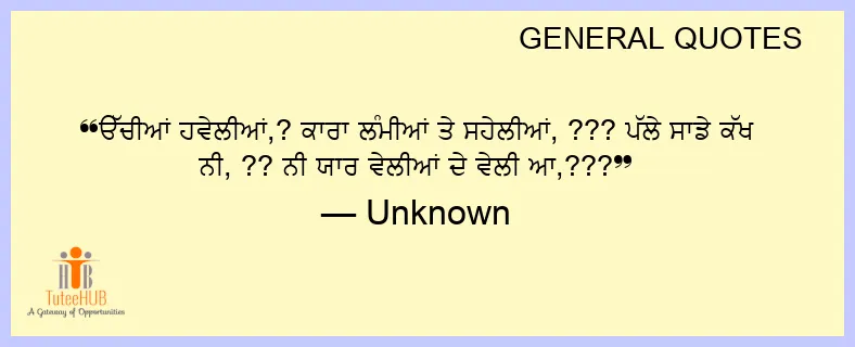 ੳੱਚੀਆਂ ਹਵੇਲੀਆਂ,? ਕਾਰਾ ਲੰਮੀਆਂ ਤੇ ਸਹੇਲੀਆਂ, ??? ਪੱਲੇ ਸਾਡੇ ਕੱਖ ਨੀ, ?? ਨੀ ਯਾਰ ਵੇਲੀਆਂ ਦੇ ਵੇਲੀ ਆ,???