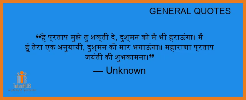 हे प्रताप मुझे तु शक्ती दे, दुश्मन को मै भी हराऊंगा। मैं हूं तेरा एक अनुयायी, दुश्मन को मार भगाऊंगा॥ महाराणा प्रताप जयंती की शुभकामना।