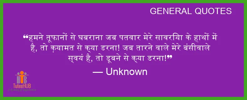 हमने तूफानों से घबराना जब पतवार मेरे सावरिया के हाथों में है, तो क़यामत से क्या डरना! जब तारने वाले मेरे बंसीवाले स्वयं है, तो डूबने से क्या डरना!