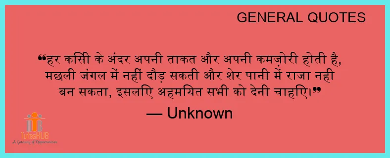 हर किसी के अंदर अपनी ताकत और अपनी कमज़ोरी होती है, मछली जंगल में नहीं दौड़ सकती और शेर पानी में राजा नही बन सकता, इसलिए अहमियत सभी को देनी चाहिए।