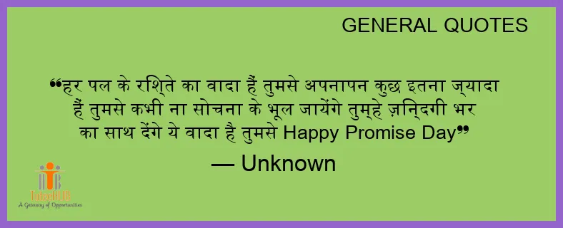 हर पल के रिश्ते का वादा हैं तुमसे अपनापन कुछ इतना ज्यादा हैं तुमसे कभी ना सोचना के भूल जायेंगे तुम्हे ज़िन्दगी भर का साथ देंगे ये वादा है तुमसे HAPPY Promise Day