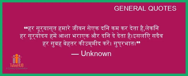 हर सूर्यास्त हमारे जीवन सेएक दिन कम कर देता है,लेकिन हर सूर्योदय हमें आशा भराएक और दिन दे देता है।इसलिए सदैव हर सुबह बेहतर कीउम्मीद करें। सुप्रभात।