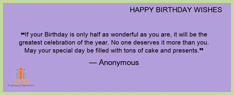 If your Birthday is only half as wonderful as you are, it will be the greatest celebration of the year. No one deserves it more than you. May your special day be filled with tons of cake and presents.