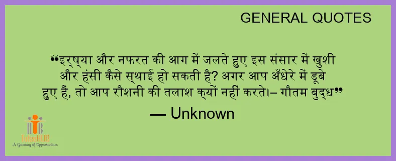 इर्ष्या और नफरत की आग में जलते हुए इस संसार में खुशी और हंसी कैसे स्थाई हो सकती है? अगर आप अँधेरे में डूबे हुए हैं, तो आप रौशनी की तलाश क्यों नहीं करते।– गौतम बुद्ध