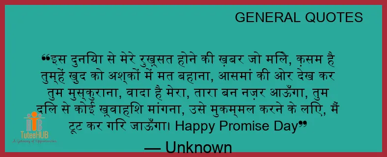 इस दुनिया से मेरे रुख़्सत होने की ख़बर जो मिले, क़सम है तुम्हें ख़ुद को अश्कों में मत बहाना, आसमां की ओर देख कर तुम मुस्कुराना, वादा है मेरा, तारा बन नज़र आऊँगा, तुम दिल से कोई ख़्वाहिश मांगना, उसे मुकम्मल करने के लिए, मैं टूट कर गिर जाऊँगा। Happy Promise Day