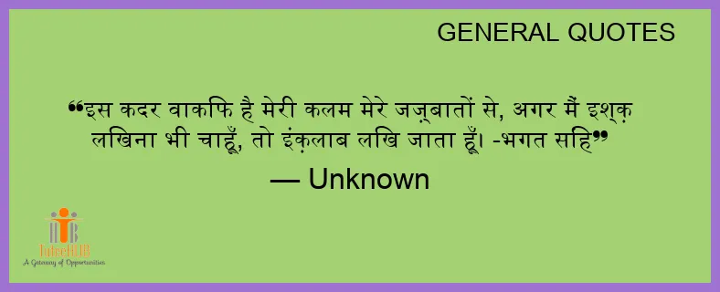 इस कदर वाकिफ है मेरी कलम मेरे जज़्बातों से, अगर मैं इश्क़ लिखना भी चाहूँ, तो इंक़लाब लिख जाता हूँ। -भगत सिंह