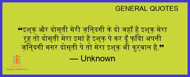 इश्क़ और दोस्ती मेरी ज़िन्दगी के दो जहाँ है इश्क़ मेरा रूह तो दोस्ती मेरा इमां है इश्क़ पे कर दूँ फ़िदा अपनी ज़िन्दगी मगर दोस्ती पे तो मेरा इश्क़ भी कुर्बान है.