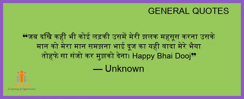 जब दिखे कहीं भी कोई लड़की उसमें मेरी झलक महसूस करना उसके मान को मेरा मान समझना भाई दूज का यही वादा मेरे भैया तोहफे सा संजो कर मुझको देना। HAPPY Bhai Dooj