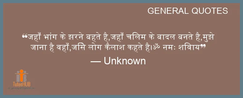 जहाँ भांग के झरने बहते है,जहाँ चिलम के बादल बनते है,मुझे जाना है वहाँ,जिसे लोग कैलाश कहते है।ॐ नमः शिवाय