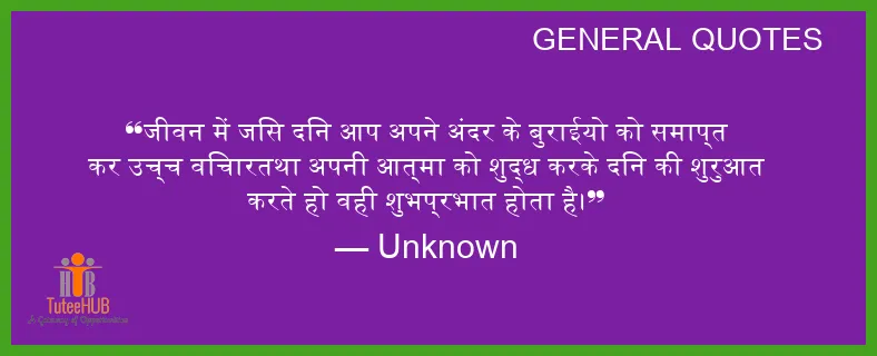 जीवन में जिस दिन आप अपने अंदर के बुराईयो को समाप्त कर उच्च विचारतथा अपनी आत्मा को शुद्ध करके दिन की शुरुआत करते हो वही शुभप्रभात होता है।