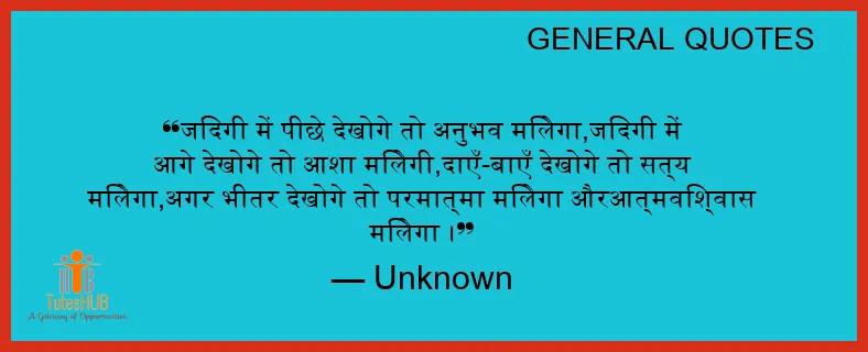 जिंदगी में पीछे देखोगे तो अनुभव मिलेगा,जिंदगी में आगे देखोगे तो आशा मिलेगी,दाएँ-बाएँ देखोगे तो सत्य मिलेगा,अगर भीतर देखोगे तो परमात्मा मिलेगा औरआत्मविश्वास मिलेगा ।