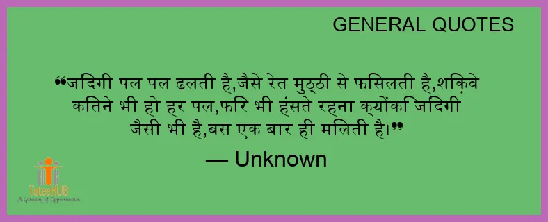 जिंदगी पल पल ढलती है,जैसे रेत मुठ्ठी से फिसलती है,शिक़वे कितने भी हो हर पल,फिर भी हंसते रहना क्योंकि जिंदगी जैसी भी है,बस एक बार ही मिलती है।