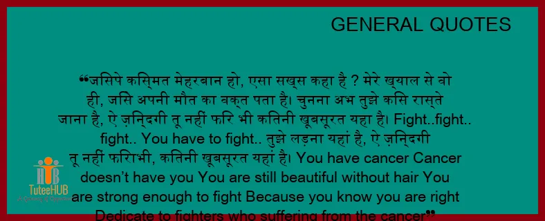 जिसपे किस्मत मेहरबान हो, एसा सख्स कहा है ? मेरे ख्याल से वो ही, जिसे अपनी मौत का वक्त पता है। चुनना अभ तुझे किस रास्ते जाना है, ऐ ज़िन्दगी तू नहीं फिर भी कितनी खूबसूरत यहा है। Fight..fight.. fight.. You have to fight.. तुझे लड़ना यहां है, ऐ ज़िन्दगी तू नहीं फिराभी, कितनी खूबसूरत यहां है। You have CANCER Cancer doesn’t have you You are still beautiful without hair You are strong enough to fight Because you know you are right Dedicate to fighters who suffering from the cancer