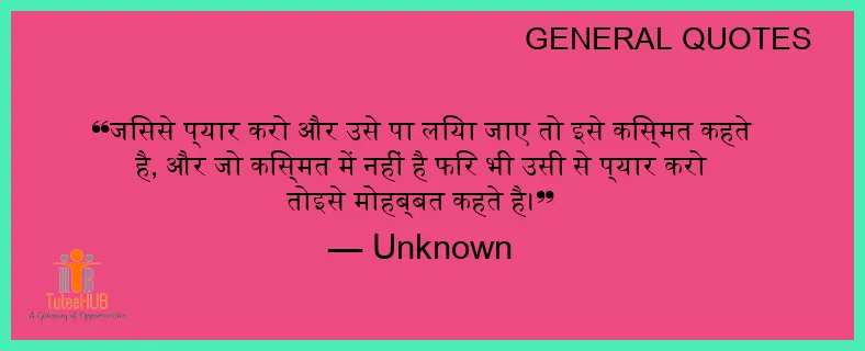जिससे प्यार करो और उसे पा लिया जाए तो इसे किस्मत कहते है, और जो किस्मत में नहीं है फिर भी उसी से प्यार करो तोइसे मोहब्बत कहते है।