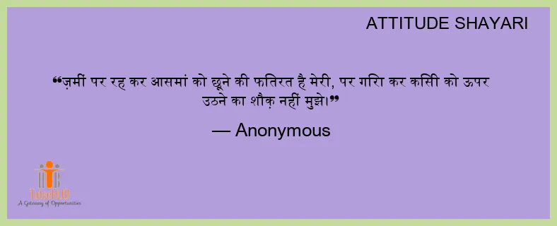 ज़मीं पर रह कर आसमां को छूने की फितरत है मेरी, पर गिरा कर किसी को ऊपर उठने का शौक़ नहीं मुझे।