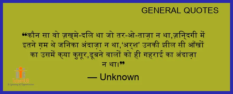 कौन सा वो ज़ख्मे-दिल था जो तर-ओ-ताज़ा न था,ज़िन्दगी में इतने ग़म थे जिनका अंदाज़ा न था,‘अर्श’ उनकी झील सी आँखों का उसमें क्या क़ुसूर,डूबने वालों को ही गहराई का अंदाज़ा न था।