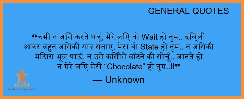 कभी न जिसे करते थकूं, मेरे लिए वो Wait हो तुम.. दिल्ली आकर बहुत जिसकी याद सताए, मेरा वो State हो तुम.. न जिसकी मिठास भूल पाऊँ, न उसे किसीसे बाँटने की सोचूँ.. जानते हो न मेरे लिए मेरी “Chocolate” हो तुम..!!
