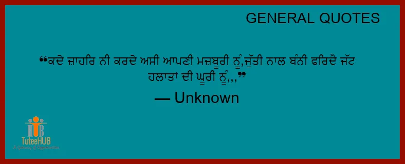 ਕਦੇ ਜ਼ਾਹਿਰ ਨੀ ਕਰਦੇ ਅਸੀਂ ਆਪਣੀ ਮਜ਼ਬੂਰੀ ਨੂੰ,ਜੁੱਤੀ ਨਾਲ ਬੰਨੀ ਫਿਰਦੈ ਜੱਟ ਹਲਾਤਾਂ ਦੀ ਘੂਰੀ ਨੂੰ,,,