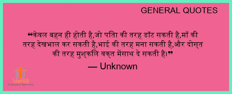 केवल बहन ही होती है,जो पिता की तरह डॉट सकती है,माँ की तरह देखभाल कर सकती है,भाई की तरह मना सकती है,और दोस्त की तरह मुश्किल वक्त मेंसाथ दे सकती है।