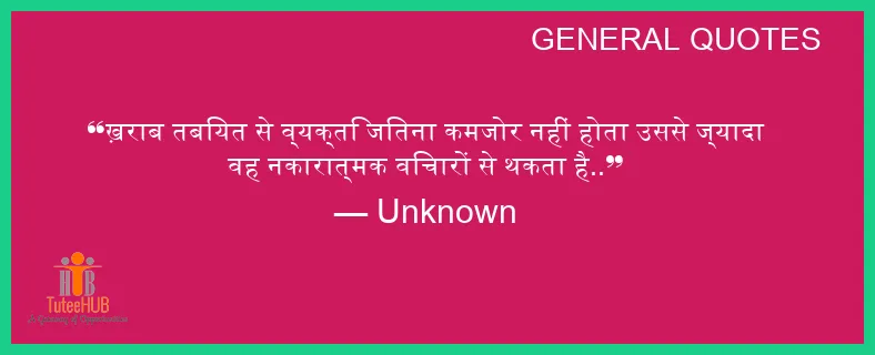 ख़राब तबियत से व्यक्ति जितना कमजोर नहीं होता उससे ज्यादा वह नकारात्मक विचारों से थकता है..