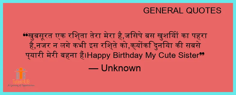 खुबसूरत एक रिश्ता तेरा मेरा है,जिसपे बस खुशियों का पहरा है,नजर न लगे कभी इस रिश्ते को,क्योंकि दुनिया की सबसे प्यारी मेरी बहना हैं।Happy Birthday My Cute Sister