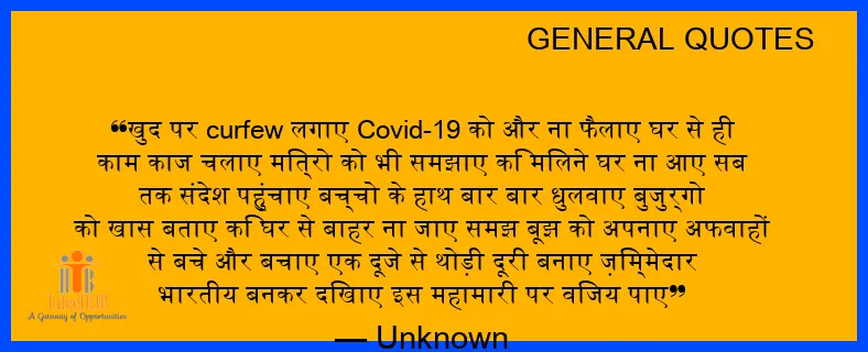 खुद पर curfew लगाए Covid-19 को और ना फैलाए घर से ही काम काज चलाए मित्रो को भी समझाए कि मिलने घर ना आए सब तक संदेश पहुंचाए बच्चो के हाथ बार बार धुलवाए बुजुर्गो को खास बताए कि घर से बाहर ना जाए समझ बूझ को अपनाए अफवाहों से बचे और बचाए एक दूजे से थोड़ी दूरी बनाए ज़िम्मेदार भारतीय बनकर दिखाए इस महामारी पर विजय पाए
