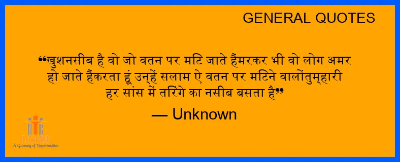 खुशनसीब है वो जो वतन पर मिट जाते हैंमरकर भी वो लोग अमर हो जाते हैंकरता हूं उन्हें सलाम ऐ वतन पर मिटने वालोंतुम्हारी हर सांस में तिरंगे का नसीब बसता है