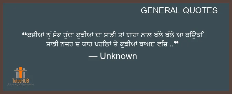 ਕਈਆਂ ਨੂੰ ਸ਼ੋਕ ਹੁੰਦਾ ਕੁੜੀਆਂ ਦਾ ਸਾਡੀ ਤਾਂ ਯਾਰਾ ਨਾਲ ਬੱਲੇ ਬੱਲੇ ਆ ਕਿਉਕਿ ਸਾਡੀ ਨਜ਼ਰ ਚ ਯਾਰ ਪਹਿਲਾਂ ਤੇ ਕੁੜੀਆਂ ਬਾਅਦ ਵਿੱਚ ..