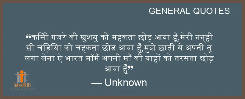 किसी गजरे की खुशबु को महकता छोड़ आया हूँ,मेरी नन्ही सी चिड़िया को चहकता छोड़ आया हूँ,मुझे छाती से अपनी तू लगा लेना ऐ भारत माँमैं अपनी माँ की बाहों को तरसता छोड़ आया हूँ