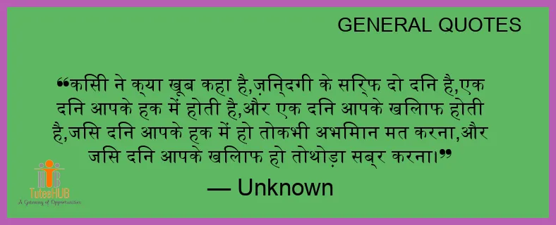 किसी ने क्या खूब कहा है,ज़िन्दगी के सिर्फ दो दिन है,एक दिन आपके हक में होती है,और एक दिन आपके खिलाफ होती है,जिस दिन आपके हक में हो तोकभी अभिमान मत करना,और जिस दिन आपके खिलाफ हो तोथोड़ा सब्र करना।