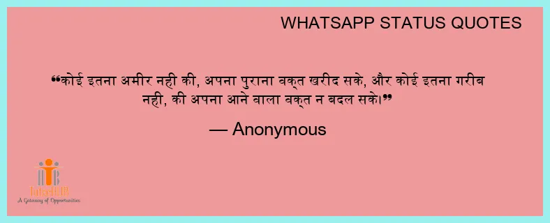 कोई इतना अमीर नही की, अपना पुराना वक्त खरीद सके, और कोई इतना गरीब नही, की अपना आने वाला वक्त न बदल सके।
