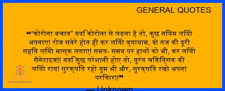 “कोरोना बचाव” यदि कोरोना से लड़ना है तो, कुछ नियम लियो अपनाए! रोज सवेरे होत ही कर लियो व्यायाम, दो गज की दूरी सहित लियो मास्क लगाए! समय- समय पर हाथों को भी, कर लियो सैनेटाइज!! यदि कुछ परेशानी होए तो, तुरंत चिकित्सक की लियो राय! सुरक्षित रहो तुम भी और, सुरक्षित रखो अपना परिवार!!