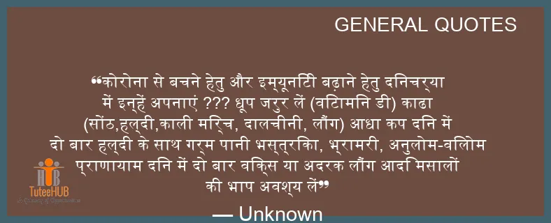 कोरोना से बचने हेतु और इम्यूनिटी बढ़ाने हेतु दिनचर्या में इन्हें अपनाएं ??? धूप जरुर लें (विटामिन डी) काढा (सोंठ,हल्दी,काली मिर्च, दालचीनी, लौंग) आधा कप दिन में दो बार हल्दी के साथ गर्म पानी भस्त्रिका, भ्रामरी, अनुलोम-विलोम प्राणायाम दिन में दो बार विक्स या अदरक लौंग आदि मसालों की भाप अवश्य लें