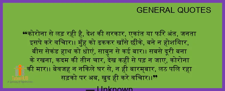 कोरोना से लड़ रही है, देश की सरकार, एकांत या फिर अंत, जनता इसपे करे विचार।। मुँह को ढककर खाँसे छींके, बने न होशियार, बीस सेकंड हाथ को धोएं, साबुन से कई बार।। सबसे दूरी बना के रखना, कदम की तीन चार, देख कहीं से पड़ न जाए, कोरोना की मार।। बेवजह न निकले घर से, न ही बारम्बार, लठ पिल रहा सड़को पर अब, खुद ही करे विचार।।