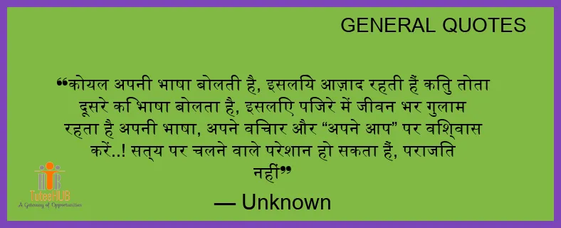 कोयल अपनी भाषा बोलती है, इसलिये आज़ाद रहती हैं किंतु तोता दूसरे कि भाषा बोलता है, इसलिए पिंजरे में जीवन भर गुलाम रहता है अपनी भाषा, अपने विचार और “अपने आप” पर विश्वास करें..! सत्य पर चलने वाले परेशान हो सकता हैं, पराजित नहीं