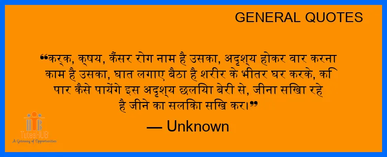 कर्क, क्षय, कैंसर रोग नाम है उसका, अदृश्य होकर वार करना काम है उसका, घात लगाए बैठा है शरीर के भीतर घर करके, कि पार कैसे पायेंगे इस अदृश्य छलिया बेरी से, जीना सिखा रहे है जीने का सलिका सिख कर।