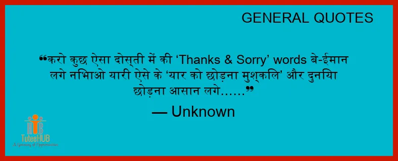 करो कुछ ऐसा दोस्ती में की ‘Thanks & SORRY’ words बे-ईमान लगे निभाओ यारी ऐसे के ‘यार को छोड़ना मुश्किल’ और दुनिया छोड़ना आसान लगे……