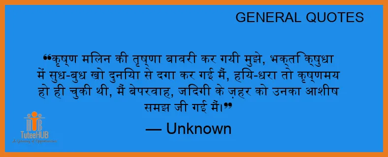 कृष्ण मिलन की तृष्णा बावरी कर गयी मुझे, भक्ति क्षुधा में सुध-बुध खो दुनिया से दगा कर गई मैं, हिय-धरा तो कृष्णमय हो ही चुकी थी, मैं बेपरवाह, जिंदगी के ज़हर को उनका आशीष समझ जी गई मैं।
