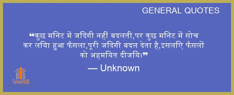 कुछ मिनट में जिंदगी नहीं बदलती,पर कुछ मिनट में सोच कर लिया हुआ फैसला,पूरी जिंदगी बदल देता है,इसलिए फैसलों को अहमियत दीजिये।