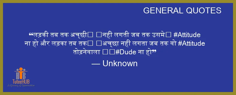 लड़की तब तक अच्छी‪ ‎नहीं लगती जब तक उसमे‪ #ATTITUDE ना हो और लड़का तब तक‪ ‎अच्छा नहीं लगता जब तक वो #Attitude तोड़नेवाला ‪‎#Dude ना हो