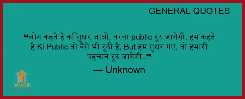 लोग कहते है कि सुधर जाओ, वरना public रूठ जायेगी, हम कहतें है Ki Public तो वैसे भी रूठी है, But हम सुधर गए, तो हमारी पहचान रूठ जायेगी..