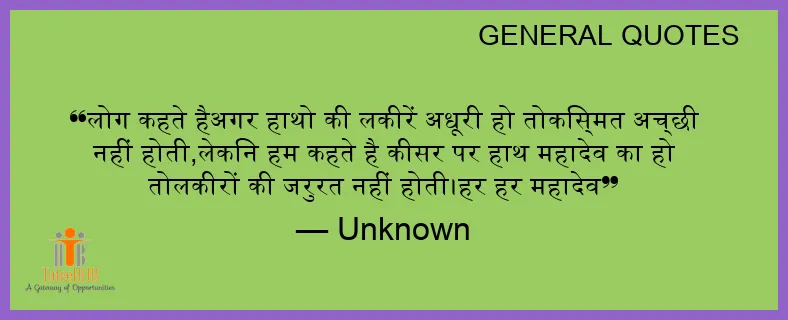 लोग कहते हैअगर हाथो की लकीरें अधूरी हो तोकिस्मत अच्छी नहीं होती,लेकिन हम कहते है कीसर पर हाथ महादेव का हो तोलकीरों की जरुरत नहीं होती।हर हर महादेव