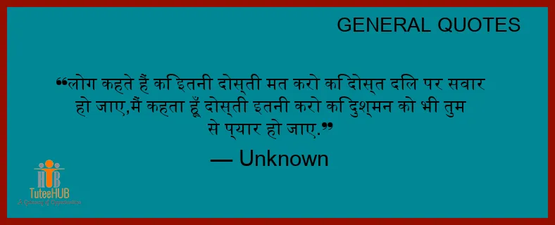लोग कहते हैं कि इतनी दोस्ती मत करो कि दोस्त दिल पर सवार हो जाए,मैं कहता हूँ दोस्ती इतनी करो कि दुश्मन को भी तुम से प्यार हो जाए.