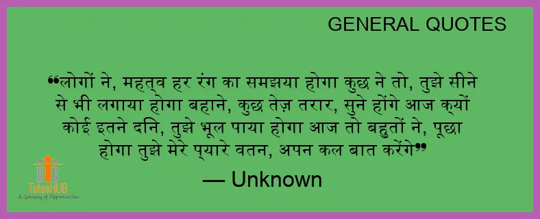 लोगों ने, महत्व हर रंग का समझया होगा कुछ ने तो, तुझे सीने से भी लगाया होगा बहाने, कुछ तेज़ तरार, सुने होंगे आज क्यों कोई इतने दिन, तुझे भूल पाया होगा आज तो बहुतों ने, पूछा होगा तुझे मेरे प्यारे वतन, अपन कल बात करेंगे