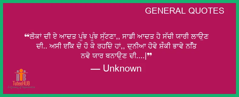 ਲੋਕਾਂ ਦੀ ੲੇ ਅਾਦਤ ਪੂੰਝ ਪੂੰਝ ਸੁੱਟਣਾ,, ਸਾਡੀ ਅਾਦਤ ਹੈ ਸੱਚੀ ਯਾਰੀ ਲਾੳੁਣ ਦੀ.. ਅਸੀਂ ੲਿੱਕ ਦੇ ਹੋ ਕੇ ਰਹਿੰਦੇ ਹਾਂ,, ਦੁਨੀਅਾ ਹੋਵੇ ਸ਼ੌਂਕੀ ਭਾਵੇ ਨਿੱਤ ਨਵੇ ਯਾਰ ਬਨਾੳੁਣ ਦੀ....|