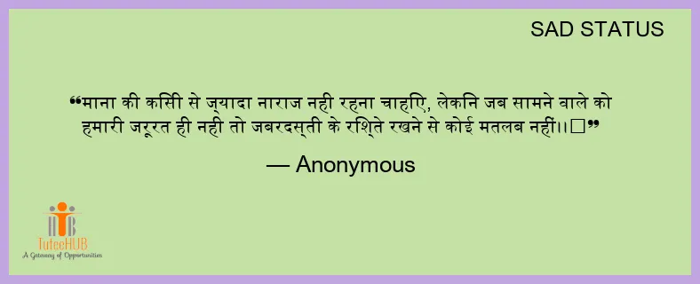 माना की किसी से ज्यादा नाराज नही रहना चाहिए, लेकिन जब सामने वाले को हमारी जरूरत ही नही तो जबरदस्ती के रिश्ते रखने से कोई मतलब नहीं।।💯