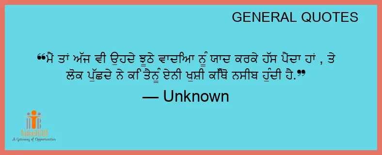 ਮੈਂ ਤਾਂ ਅੱਜ ਵੀ ਉਹਦੇ ਝੂਠੇ ਵਾਦਿਆ ਨੂੰ ਯਾਦ ਕਰਕੇ ਹੱਸ ਪੈਂਦਾ ਹਾਂ , ਤੇ ਲੋਕ ਪੁੱਛਦੇ ਨੇ ਕਿ ਤੈਨੂੰ ਏਨੀ ਖੁਸ਼ੀ ਕਿੱਥੋਂ ਨਸੀਬ ਹੁੰਦੀ ਹੈ.