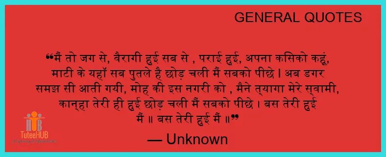 मैं तो जग से, वैरागी हुई सब से , पराई हुई, अपना किसको कहूं, माटी के यहाॅ सब पुतले है छोड़ चली मैं सबको पीछे I अब डगर समझ सी आती गयी, मोह की इस नगरी को , मैने त्यागा मेरे स्वामी, कान्हा तेरी ही हुई छोड़ चली मैं सबको पीछे । बस तेरी हुई मैं ॥ बस तेरी हुई मैं ॥