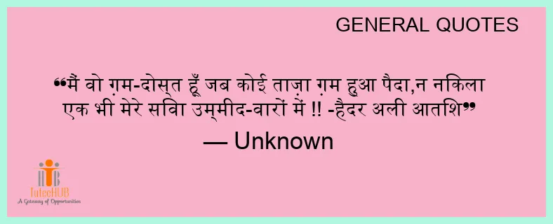 मैं वो ग़म-दोस्त हूँ जब कोई ताज़ा ग़म हुआ पैदा,न निकला एक भी मेरे सिवा उम्मीद-वारों में !! -हैदर अली आतिश